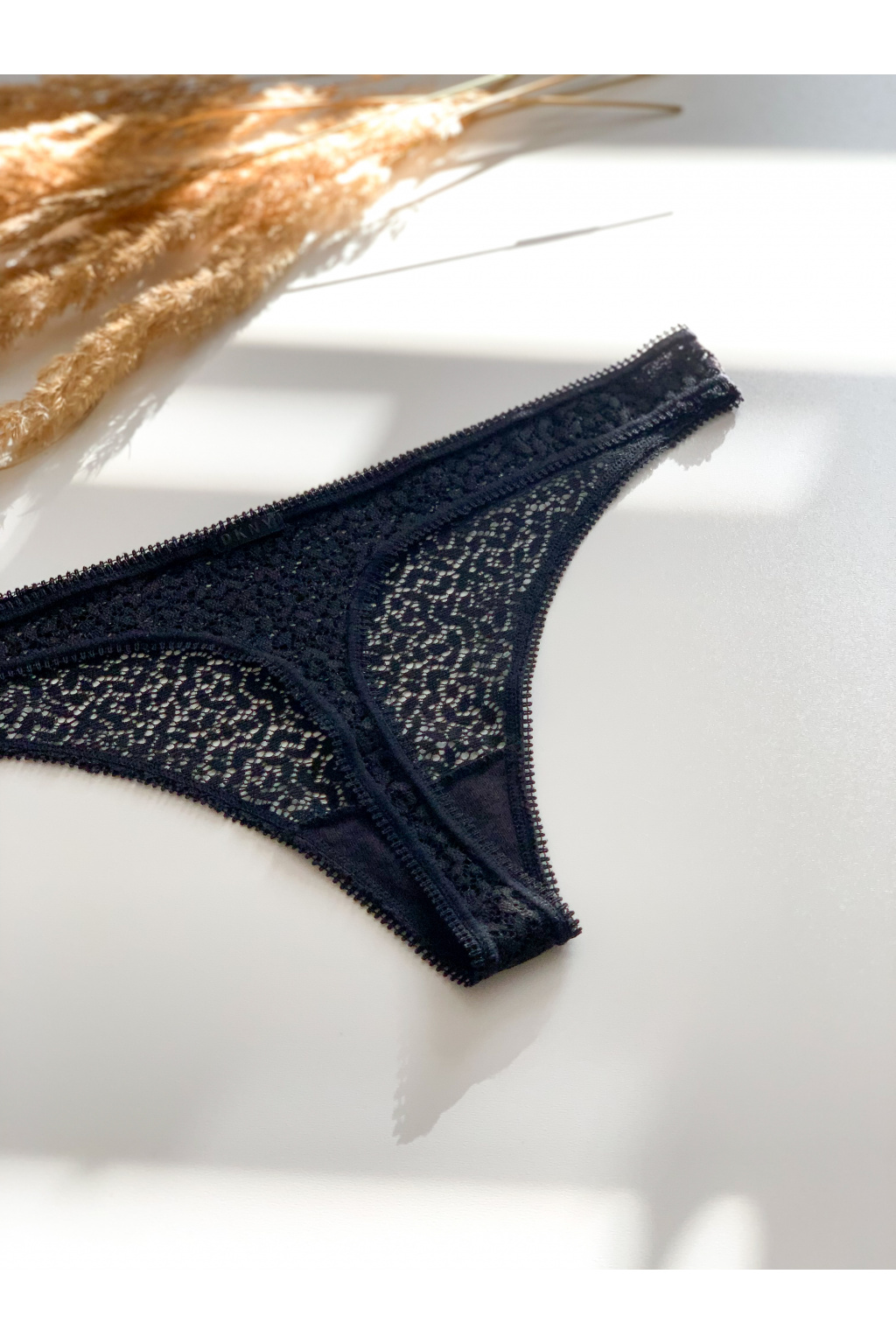Jemná krajka dodává kalhotkám ženský vzhled, ale na dotek zůstává příjemná a pod oblečením nepůsobí rušivě. Tangový střih působí lichotivě i při každodenním nošení.